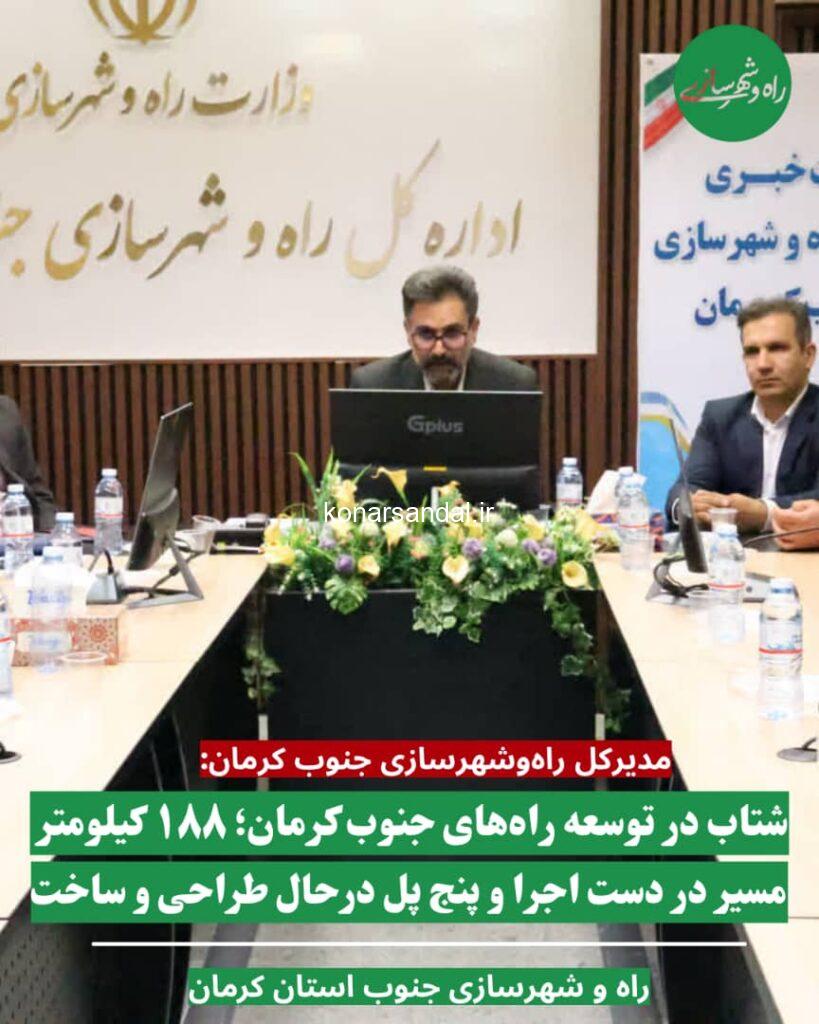 مدیرکل راه و شهرسازی جنوب کرمان از اجرای ۱۸۸ کیلومتر پروژه راهسازی در محورهای مختلف منطقه خبر داد و گفت: پنج پل بزرگ نیز در حال طراحی و ساخت است که تکمیل آنها نقش مؤثری در توسعه زیرساختی و ارتقای ایمنی تردد در جنوب استان دارد.وی همچنین از افتتاح مجتمع فرهنگی امام خامنهای قلعهگنج در دهه فجر امسال خبر داد.